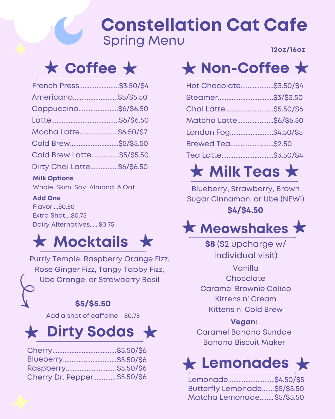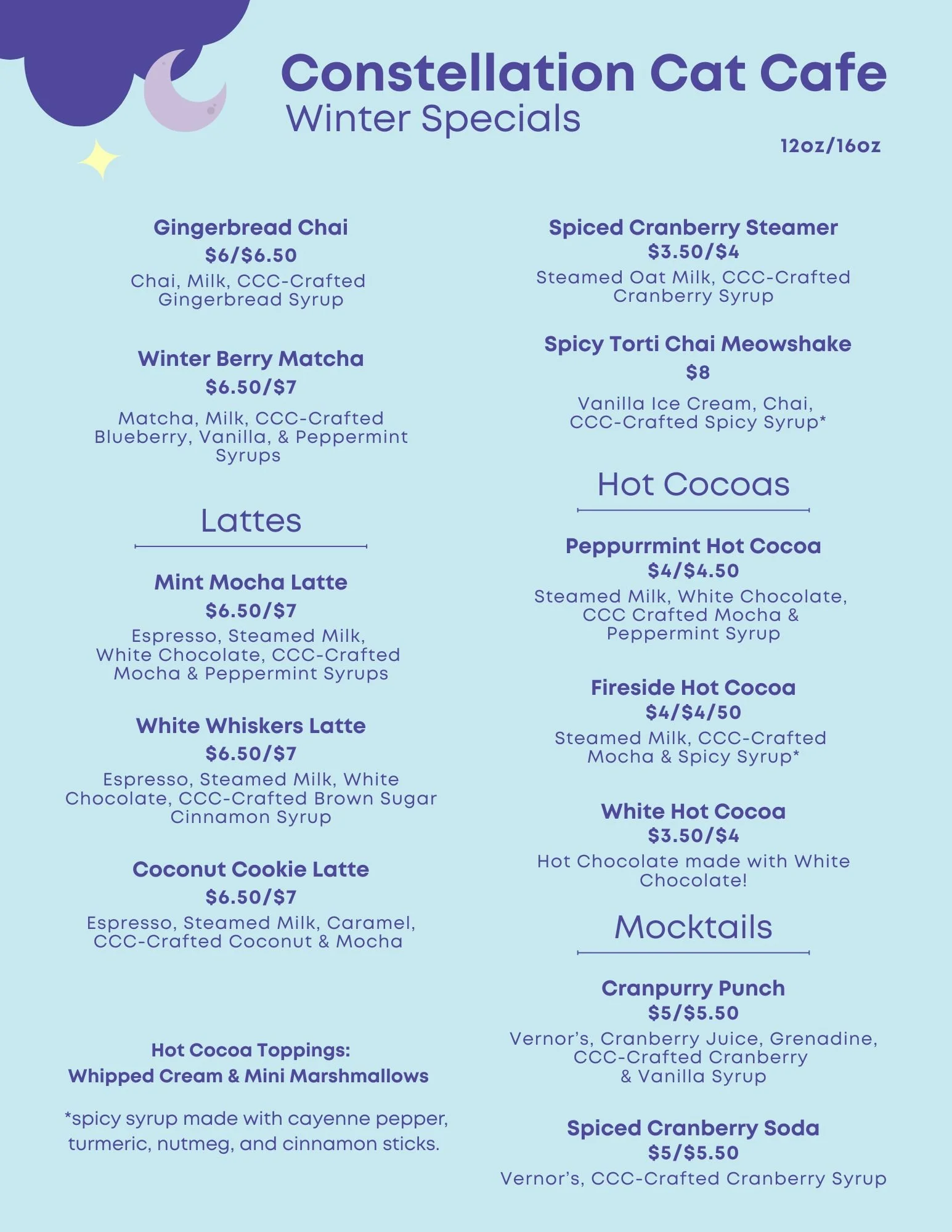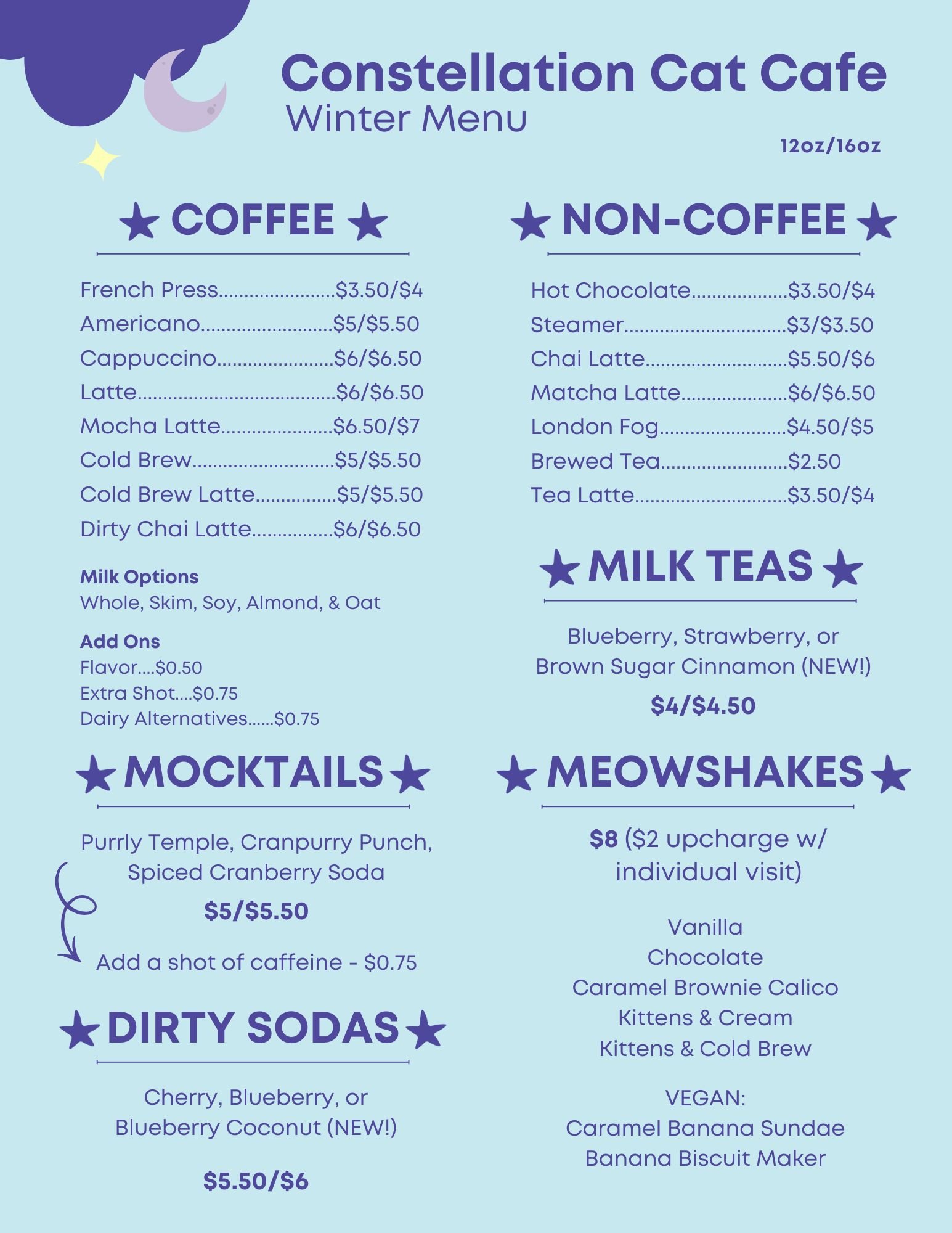 Constellation Cat Cafe is a 501c3 nonprofit and a full-service coffee shop. Schedule your visit online and meet up to 20 adoptable cats in our cat room! We also host birthday parties, private rentals, and other events. Come sip on your favorite beverage, shop, and spend quality time with cats!